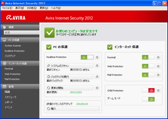Avira Internet Security(アビラ インターネット セキュリティ)は、ウイルス対策やフィッシング対策などに加え、悪意のあるコンテンツのフィルタリングやペアレンタルコントロールなど、家庭のPC環境を一本で包括的に保護するセキュリティソフトです。最新版のAvira Internet Security 2013では、個人情報保護の強化に重点が置かれており、Webサイト閲覧時の追跡防止機能や、検索エンジンの検索結果にサイトの安全性を表示する機能などが新搭載されています。有料版のAvira Antivirus Proの購入はこちら(アクセス先のページは英語表記となっております。ページ内の「Buy Now」をクリックし、次の画面の右上から言語を日本語に変更できます。)